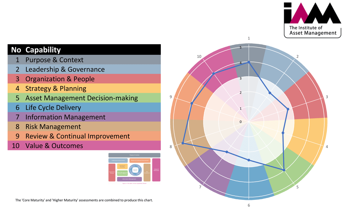 - A ‘generic’ maturity scale based on the scale developed by the IAM Maturity Group displaying results on a scale of 0 to 5.