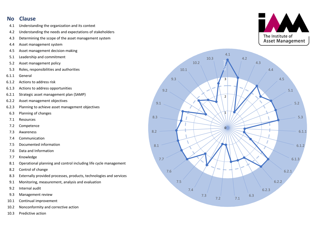 - A generic maturity scale based on the scale developed by the IAM Maturity Group displaying results on a scale of 0 to 3 (the level of compliance with ISO 55001). Note: The scale also allows for greater scores to be recorded ‘beyond’ ISO 55001 compliance requirements.